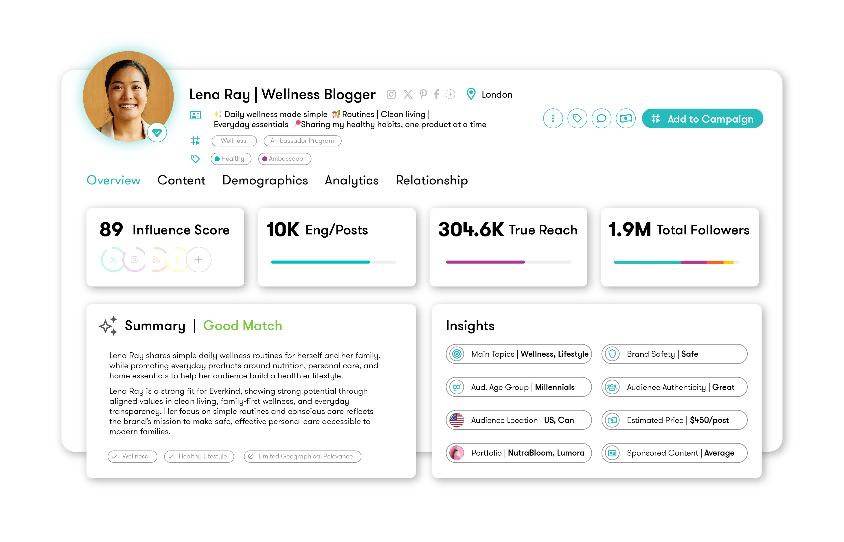 Find high-impact partners with AI-powered discovery and recommendations. Surface creators who reflect your brand values and use tailored insights to ensure the best fit.